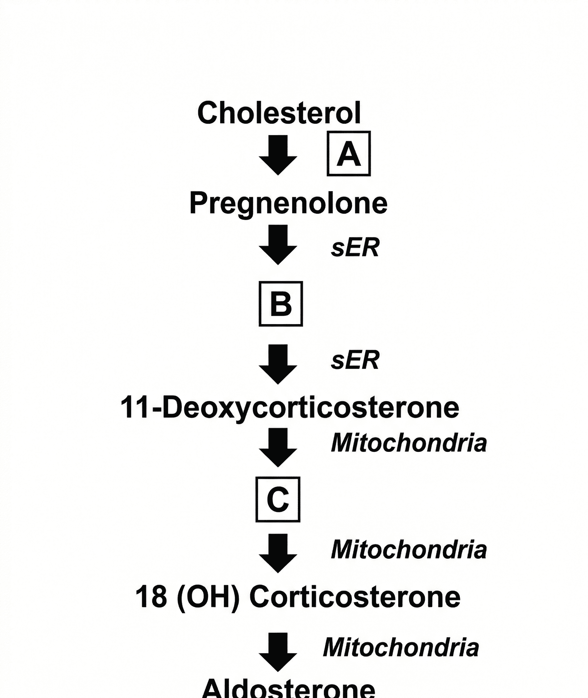 The following diagram represents steroidogenic pathway in the Zona Glomerulosa of the adrenal cortex:What do A, B and C represents, respectively?